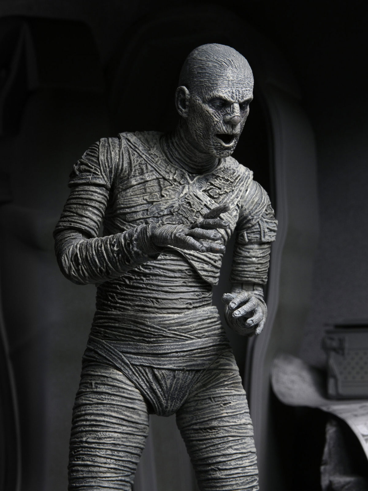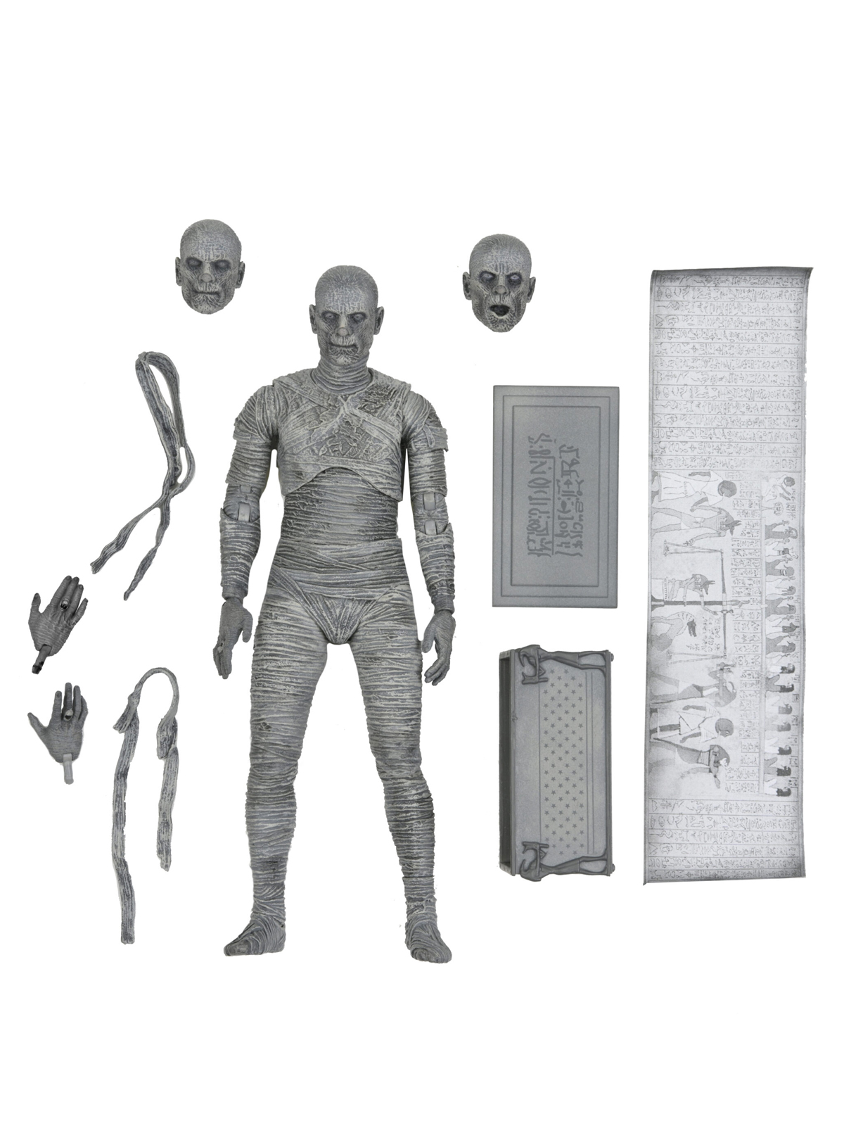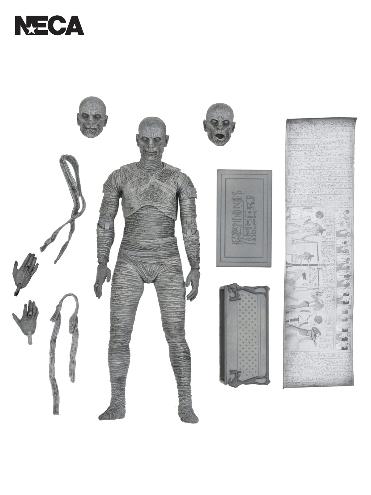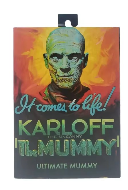 For the 90th anniversary of the extraordinary silver-screen classic, NECA presents The Mummy action figure in authentic black and white. In this Universal Monsters classic of horror, Boris Karloff shines as the ancient Mummy in a tale of love transcending death. The sculpt captures the intricate special effects make up that required eight hours to apply and two hours to remove.