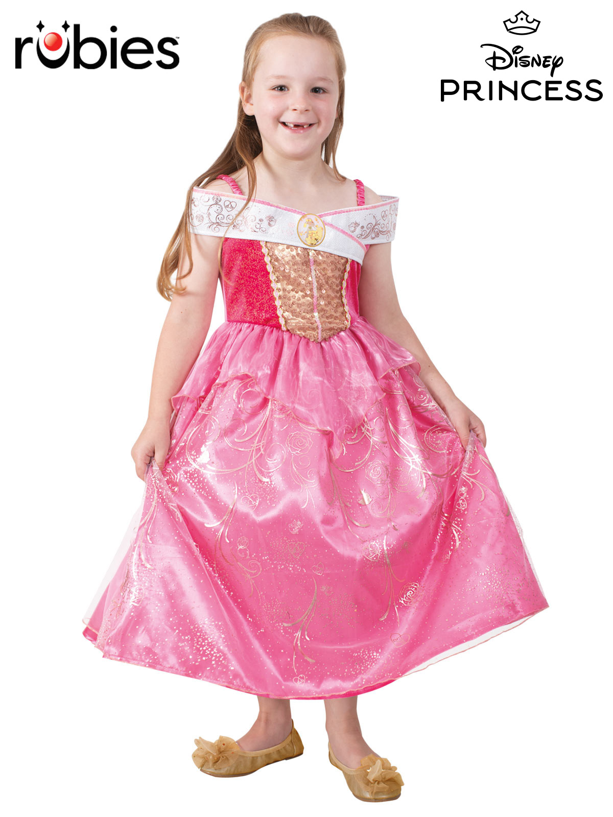 - Exquisite dress with a gold foil velour bodice and featuring rose gold sequins and a white satin shoulder peplum with character pendant at the centre