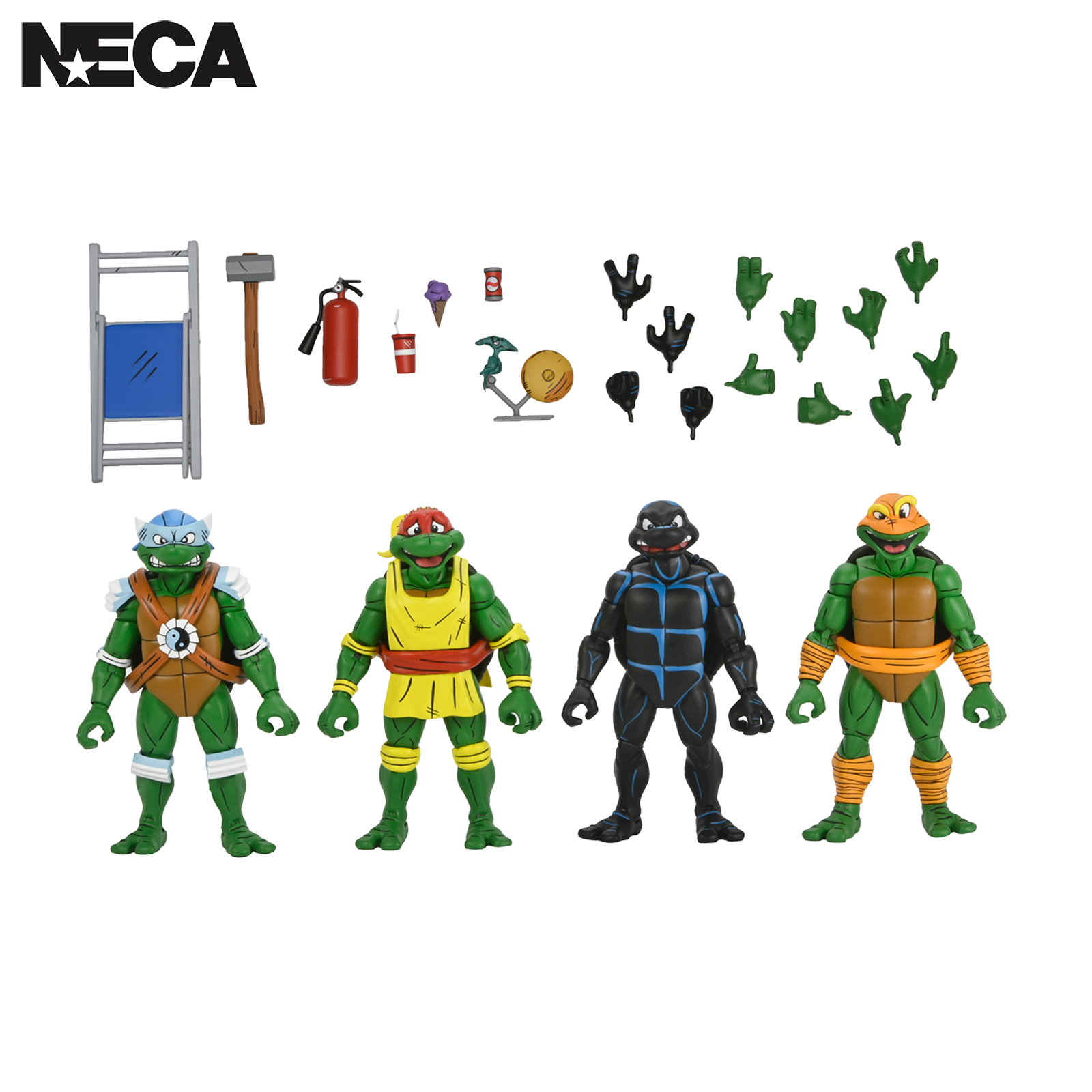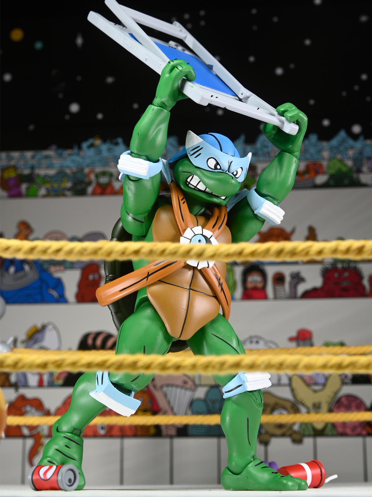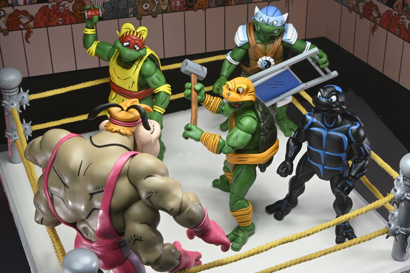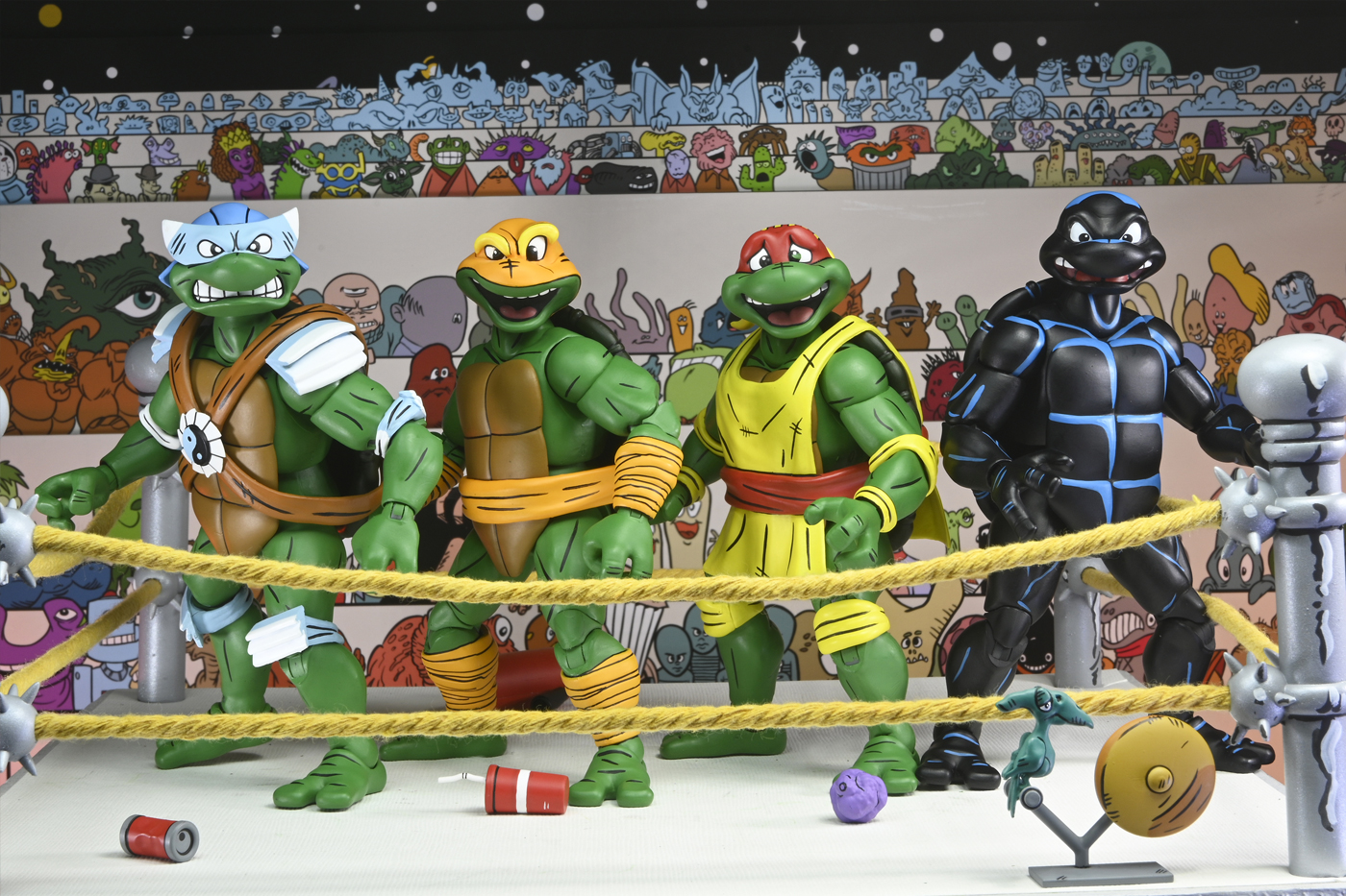 • 4 x 7″ scale action figures of the Turtles based on their iconic wrestling appearance