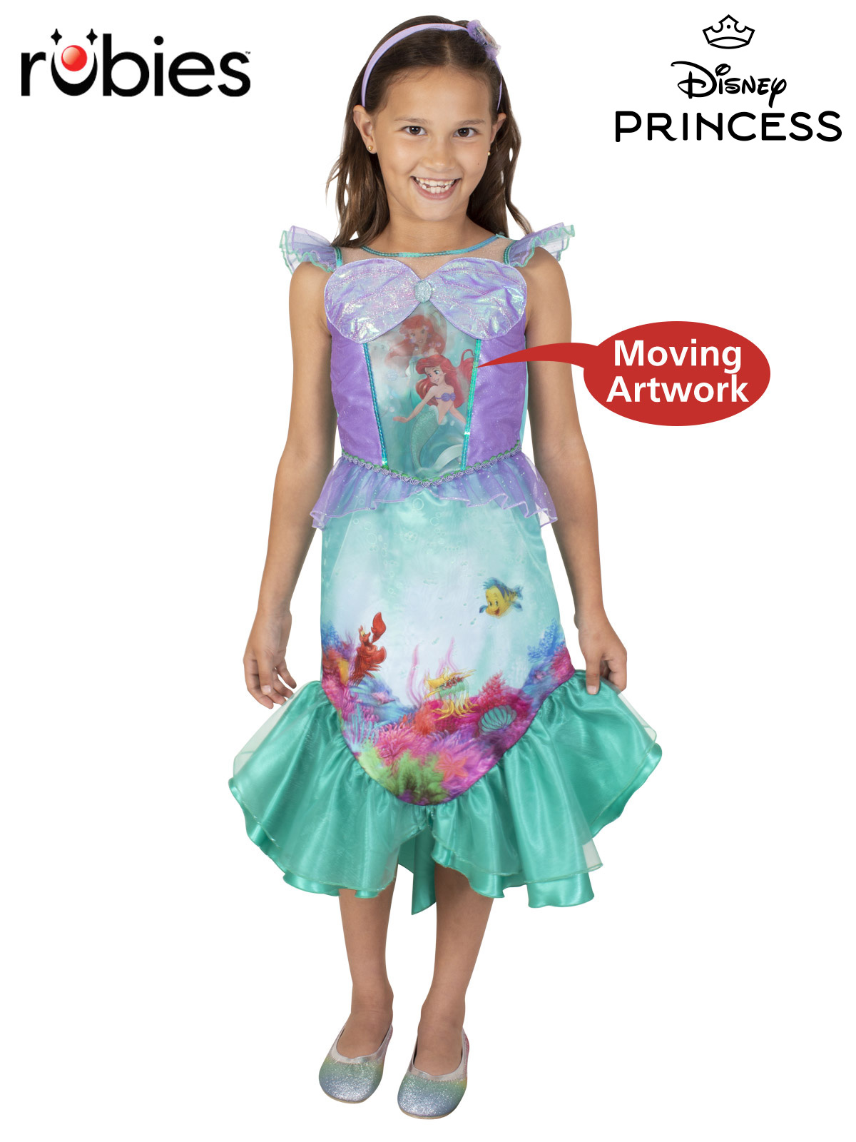 - Dress with glitter and satin bodice featuring lenticular panel with sequin edging. Panel has two images of Ariel underwater as a Mermaid with sea life and Ariel in her Princess gown. Heart shaped pendant and glittery bra attached