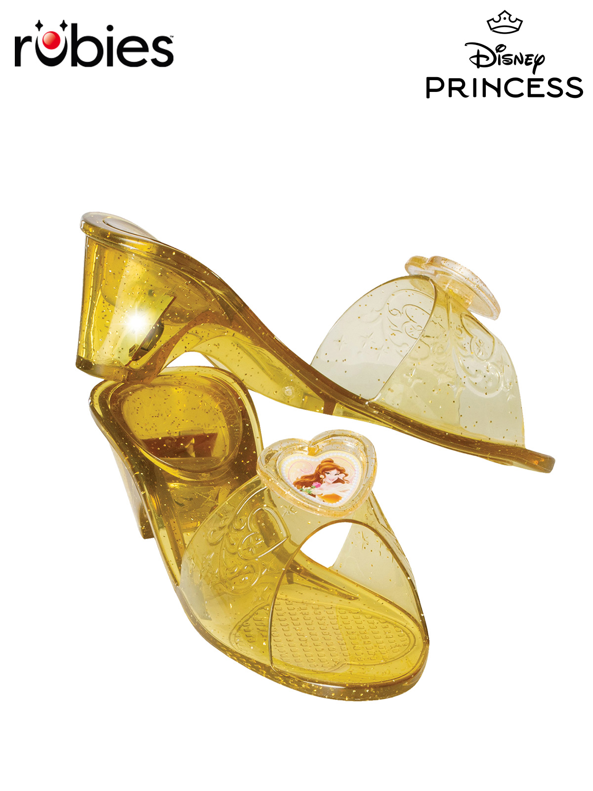 - Soft plastic gold shoe with slight heel and glittery design throughout plus light up function in the heel