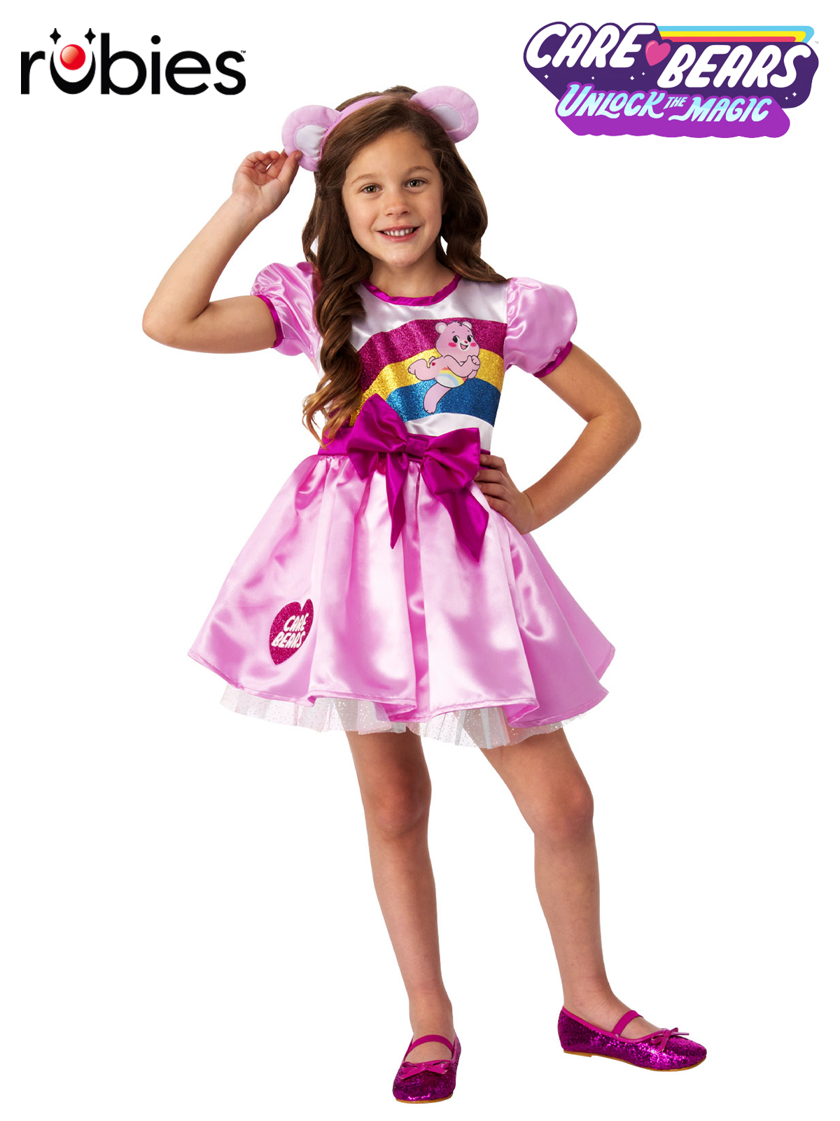 - Dress has puff sleeves, a large hot pink ribbbon at the waist and Care Bears love heart on the skirt