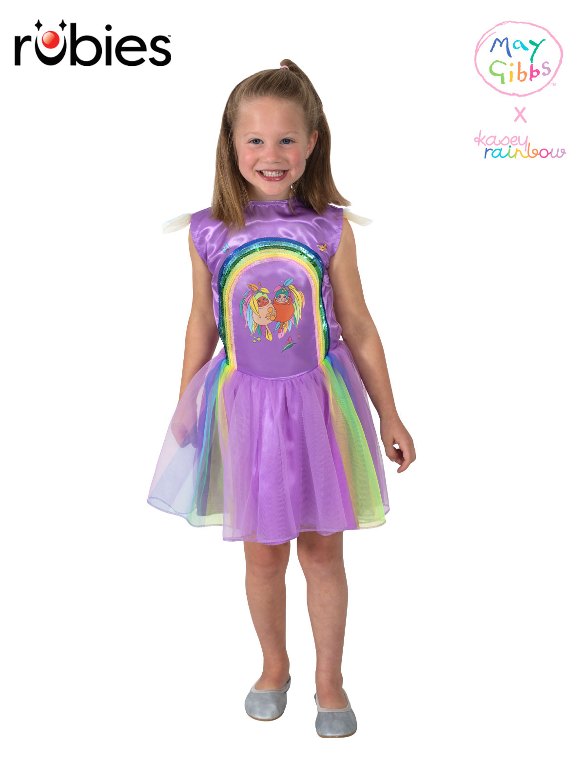- Tutu dress with satin bodice in purple tones features digitally printed Gumnuts babies and Australiana imagery on the front with colourful rainbow Eucalyptus leaves