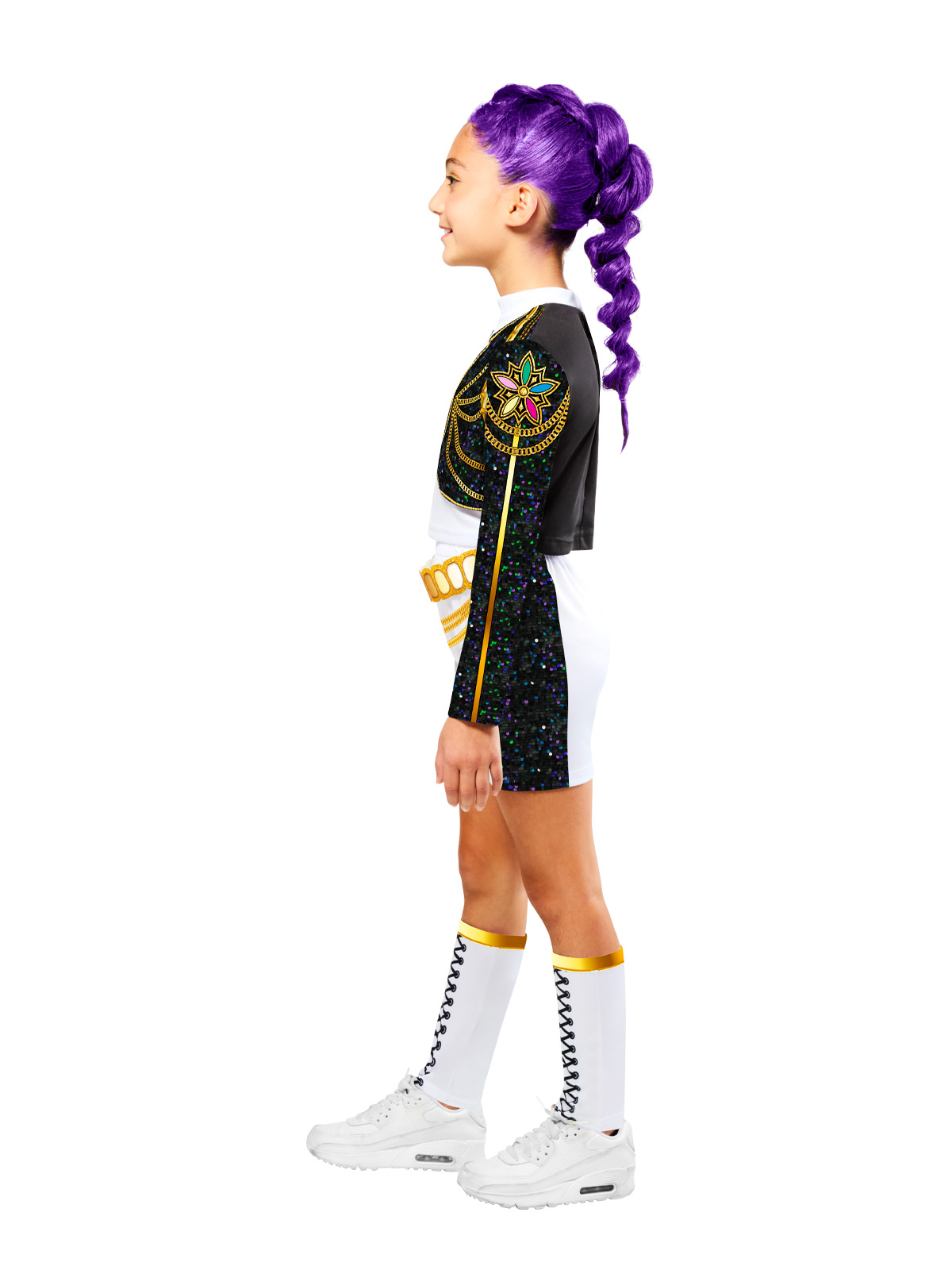 - Rumi’s Hybrid Golden look features a digitally printed top with mock jacket attached