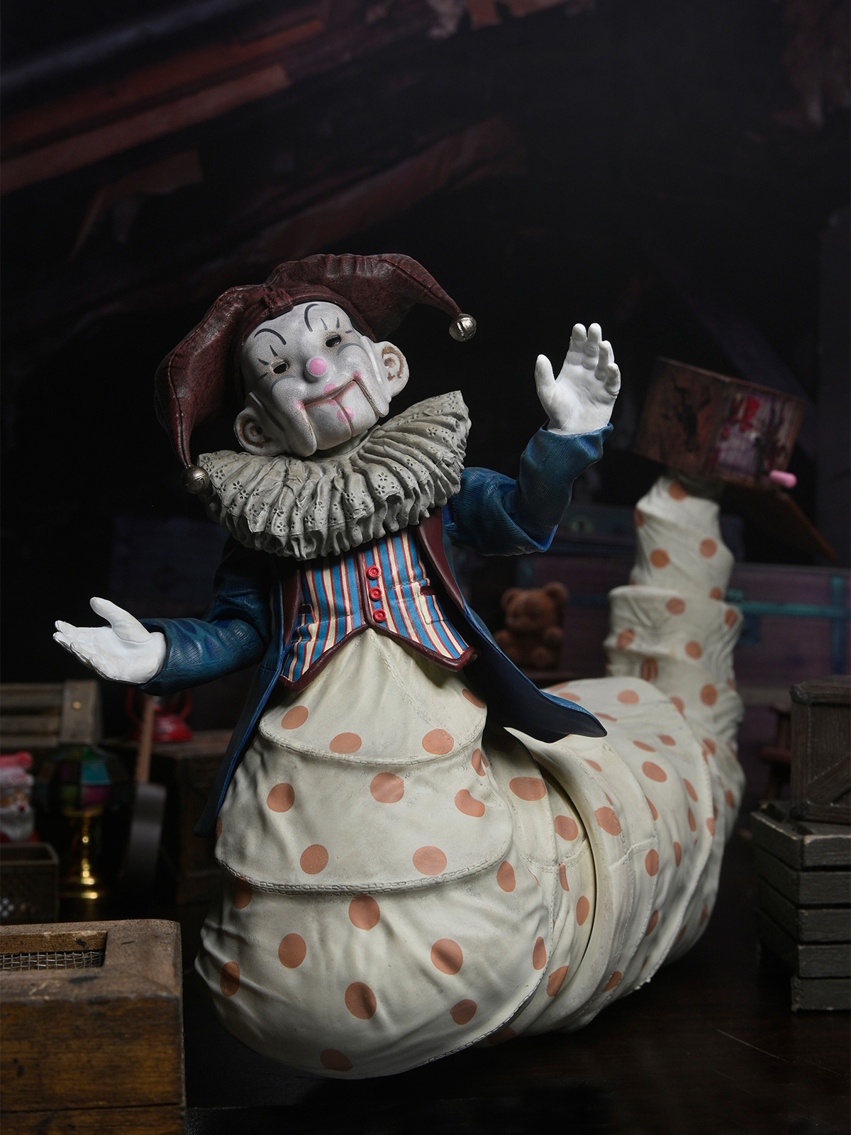 The murderous jack-in-the-box from the 2015 spooky Christmas film Krampus is now a deluxe NECA action figure ready to spread some yuletide fear! At over 10 inches long, this incredibly detailed Der Klown figure is the perfect chilling addition to your annual holiday horror display and comes with a variety of accessories. Looking just like his creepy on-screen counterpart, this figure has an articulated tail which ends in his jack-in-the-box, complete with hinged lid.