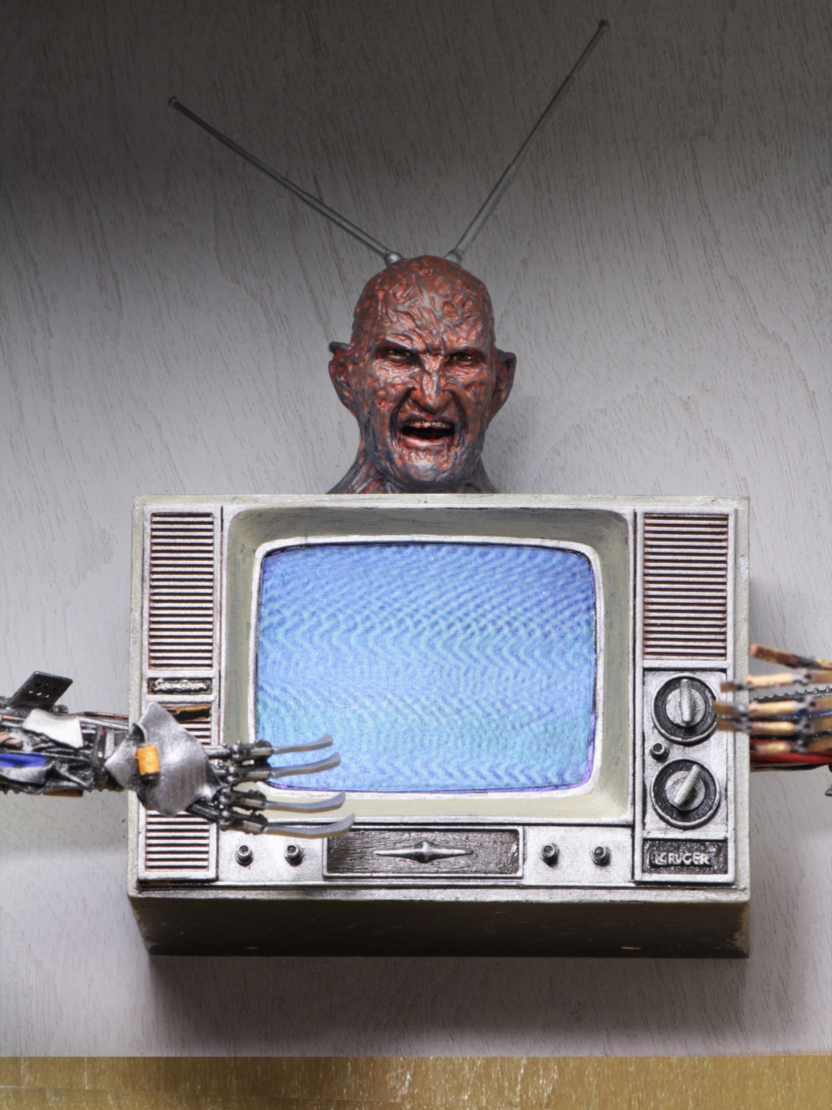- Freddy TV can be mounted on a diorama wall or displayed on desk or shelf. The arms are articulated and the antenna on Freddy’s head can be positioned