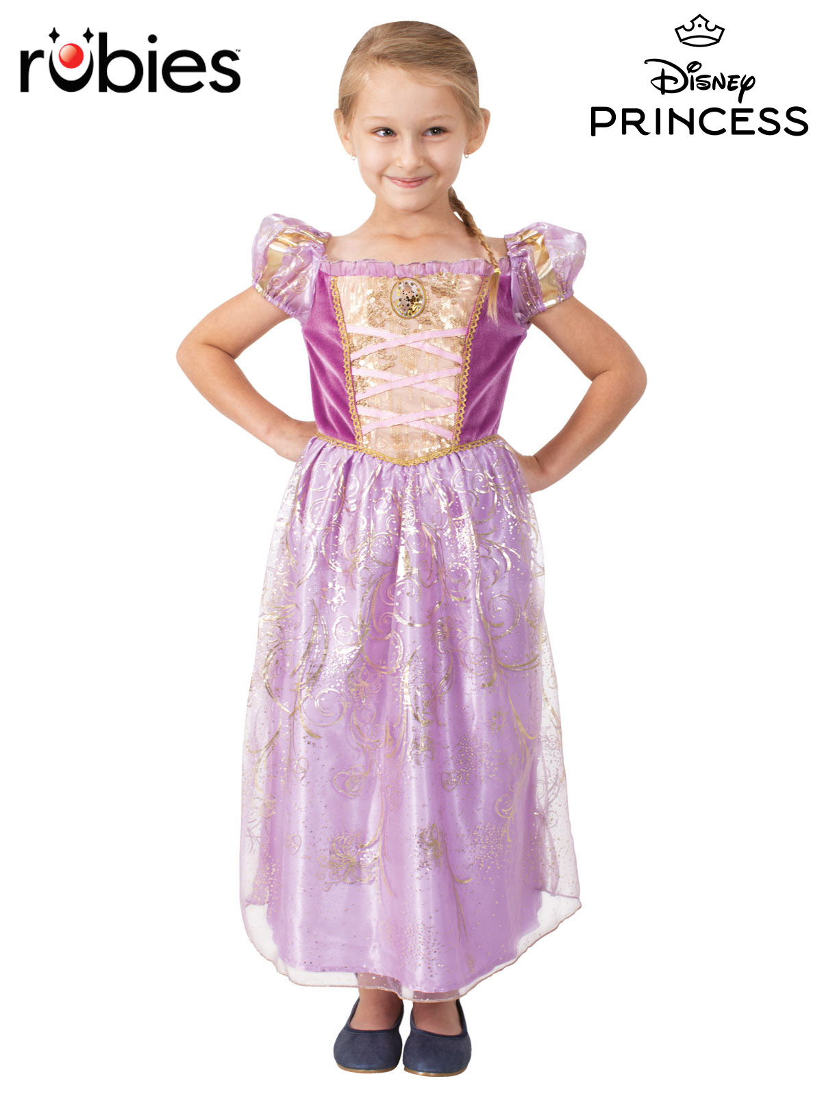 - Exquisite dress with a gold foil velour bodice and featuring gold sequins, criss-cross ribbon design and a character pendant at the centre