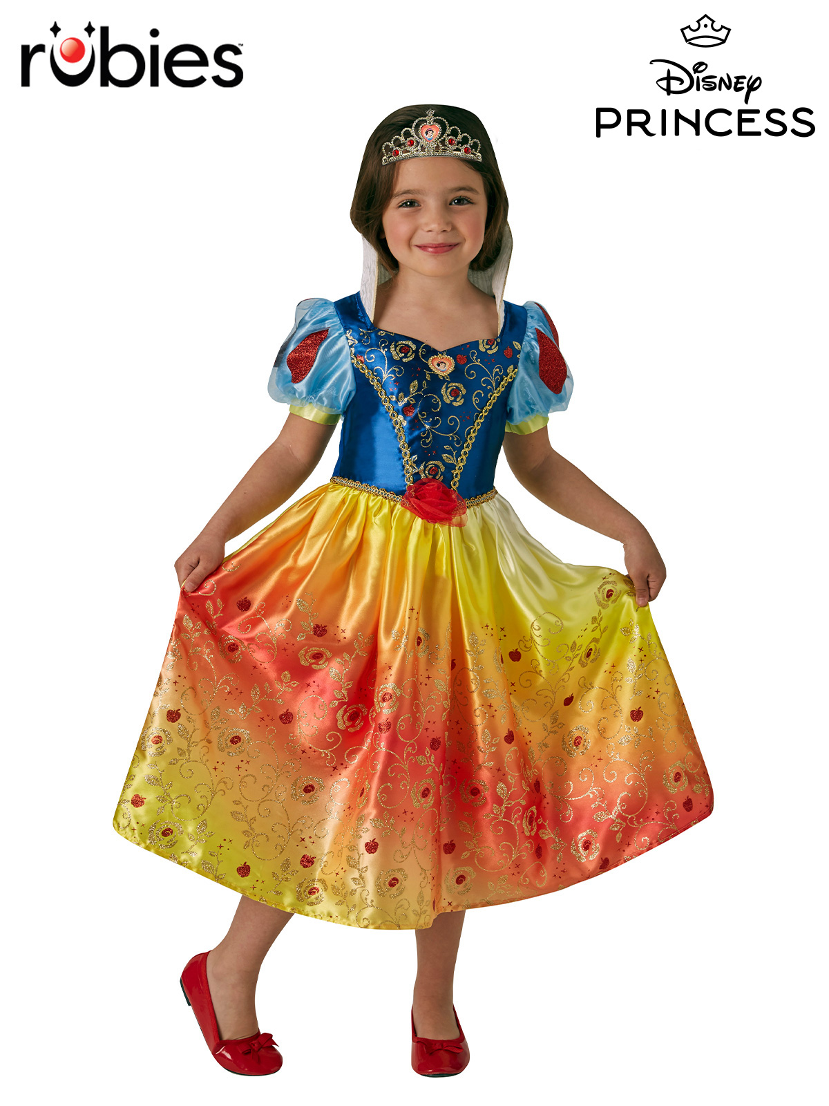 - Satin bodice with gold and red glitter print and gold trimming, plus heart shaped pendant with character image