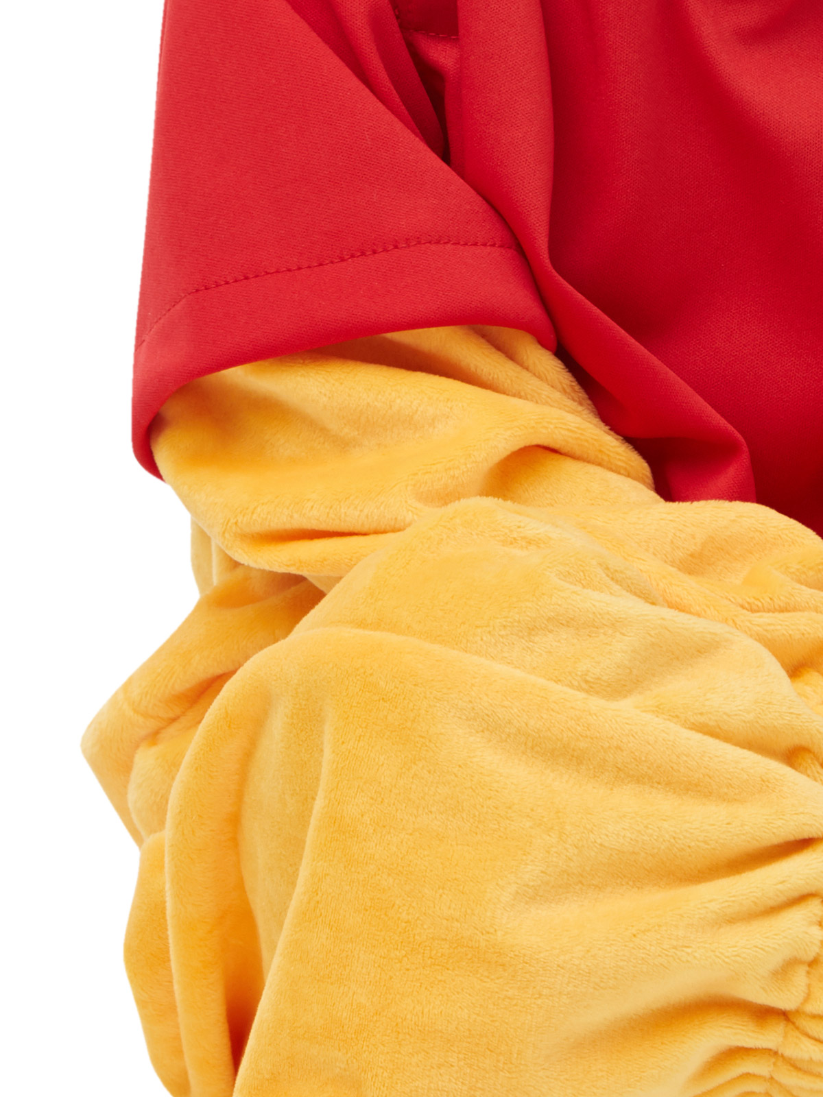 - Plush all in one jumpsuit in polar fleece material, with attached red t-shirt